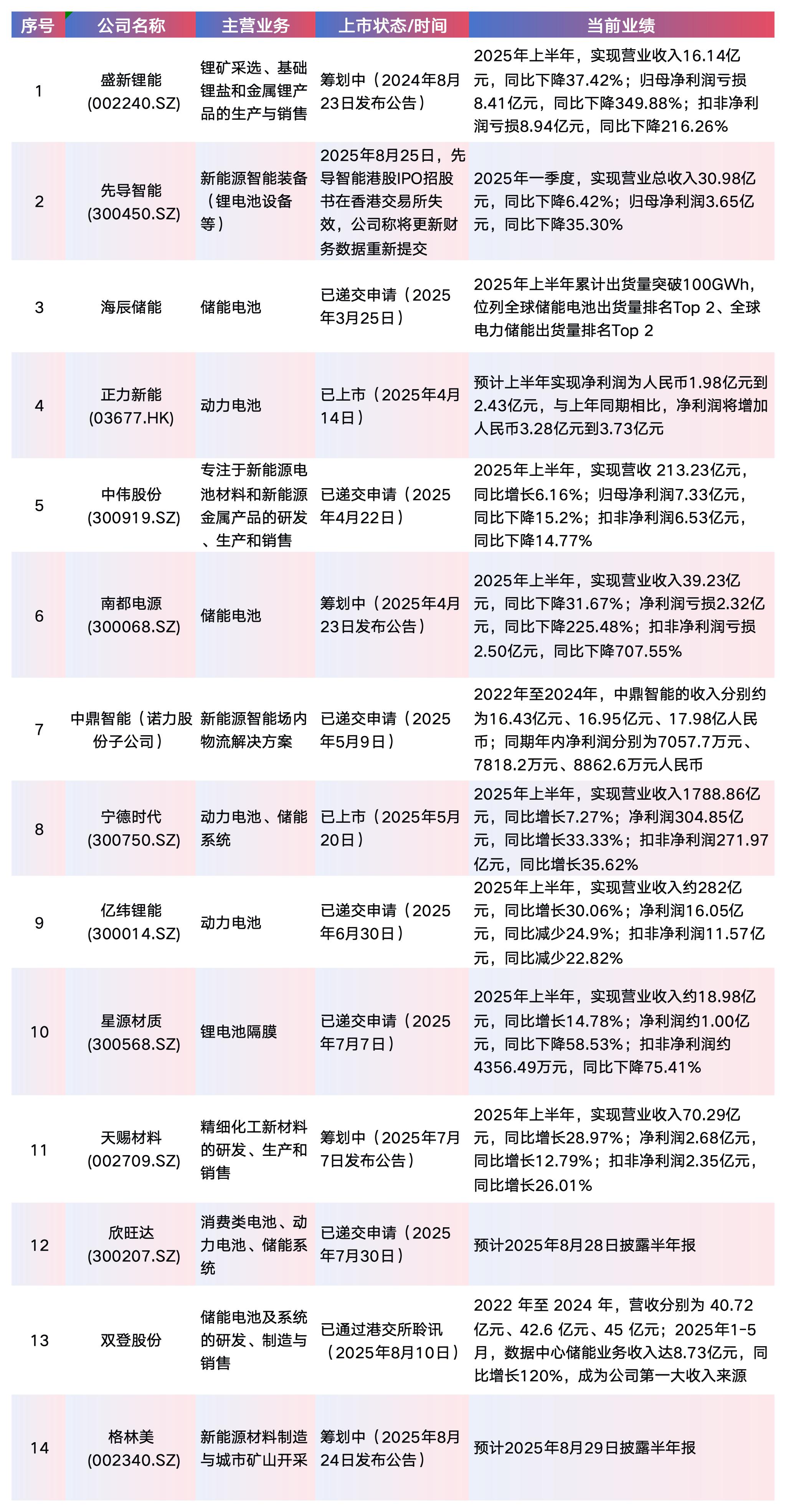 从企业类型看,这14家企业可分为两类:一类是已在A股上市、推进 “A+H” 双资本平台的龙头,如宁德时代、亿纬锂能、欣旺达、中伟股份(300919.SZ)等;另一类是未登陆A股、直接选择港股的企业,如海辰储能、双登股份。