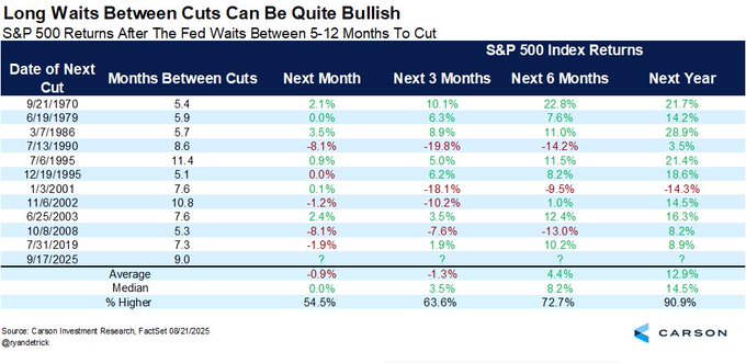 而若仔细算算日子,如果美联储真的在9月降息,那么距离其2024年12月的上次降息,其实将正好过去九个月——这已经是一段不算短的政策空窗期了。那么,在历史上,当美联储暂停许久后重启降息,美股通常会怎么走呢?