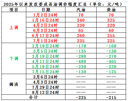 2025年以来,国内成品油零售限价已经历十六轮调整窗口,分别为“六涨六跌四搁浅”。调价后,国内汽、柴油价格每吨较去年底分别累计下跌225元、215元。