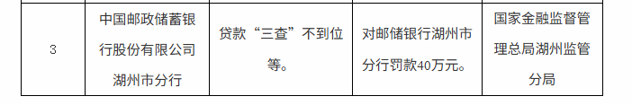 近日,国家金融监督管理总局信息显示,中国邮政储蓄银行股份有限公司湖州市分行因贷款“三查”不到位等,被国家金融监督管理总局湖州监管分局对邮储银行湖州市分行罚款40万元。