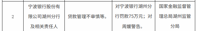 近日,国家金融监督管理总局信息显示,宁波银行股份有限公司湖州分行及相关责任人因贷款管理不审慎等,被国家金融监督管理总局湖州监管分局对宁波银行湖州分行罚款75万元;对周媛警告。