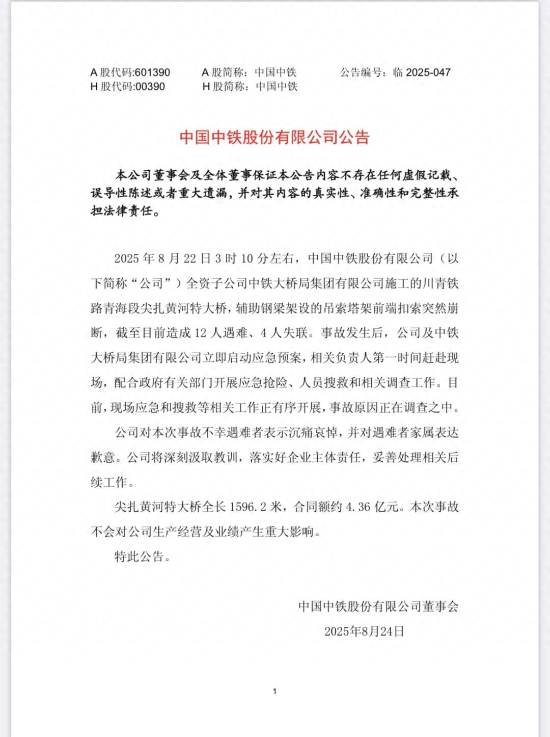 2025年8月22日3时10分左右,中国中铁股份有限公司全资子公司中铁大桥局集团有限公司施工的川青铁路青海段尖扎黄河特大桥,辅助钢梁架设的吊索塔架前端扣索突然崩断,截至目前造成12人遇难、4人失联。