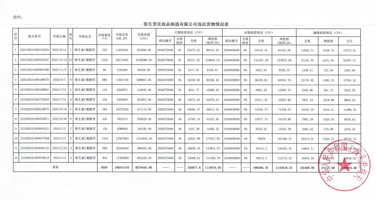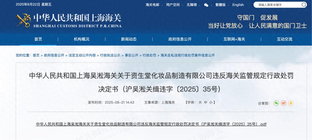 8月21日,中华人民共和国上海海关官网显示,资生堂化妆品制造有限公司(以下简称“资生堂”)违反海关监管规定被行政处罚。