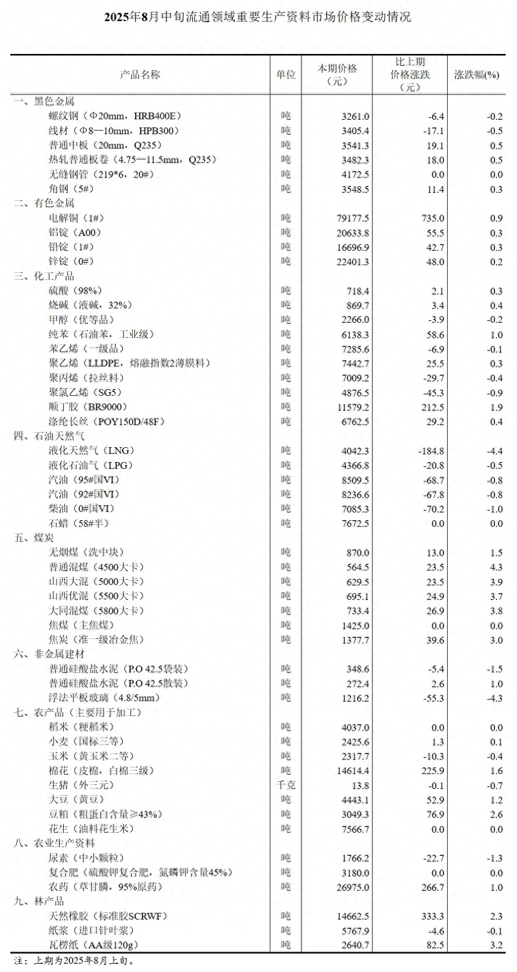 据对全国流通领域9大类50种重要生产资料市场价格的监测显示,2025年8月中旬与8月上旬相比,27种产品价格上涨,17种下降,6种持平。