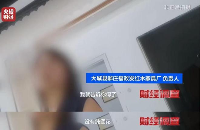 而在大城的红木市场里,这样的商户并非个例。在一家名为“福政发”的店铺中,负责人面对记者对家具是缅花还是泰花、是否掺泰花而产生的疑问时,对方显得慌乱又紧张。