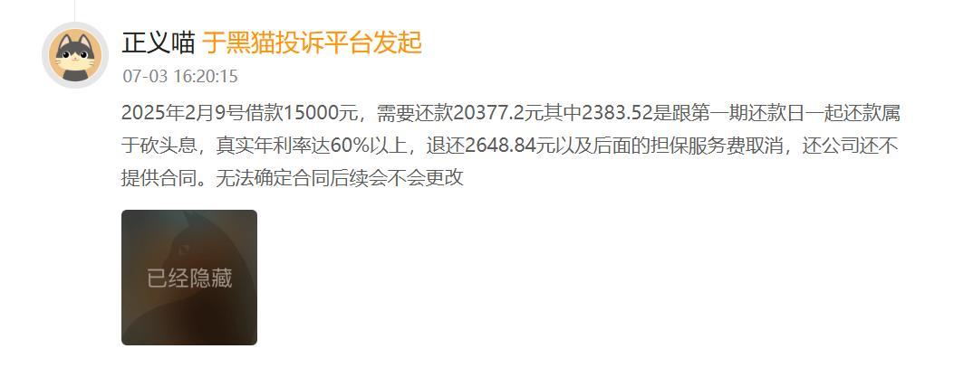 有借款用户在黑猫投诉上表示,借一万本金要还一万六,综合年利率达到60%。还有借款用户表示,今年2月9号借款15000元,需要还款20377.2元,其中2383.52元是跟第一期还款日一起还款,质疑其属于“砍头息”,真实年利率达60%以上。