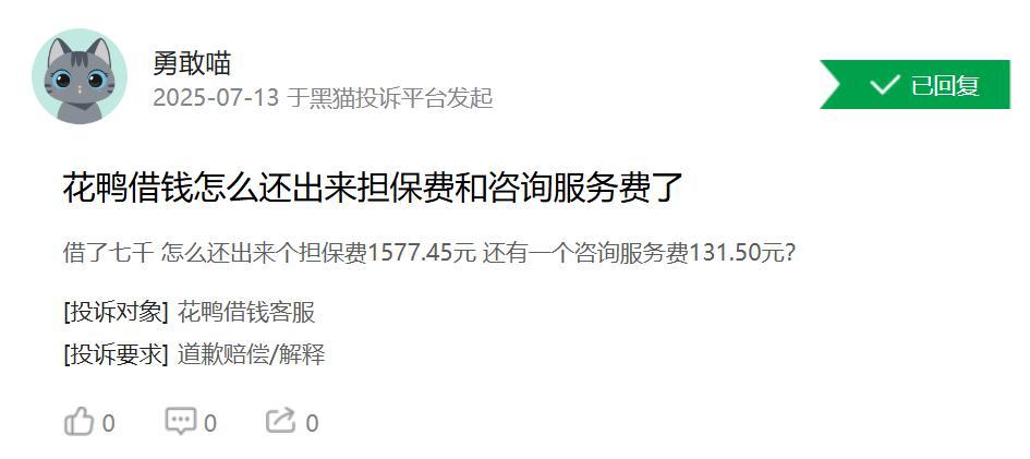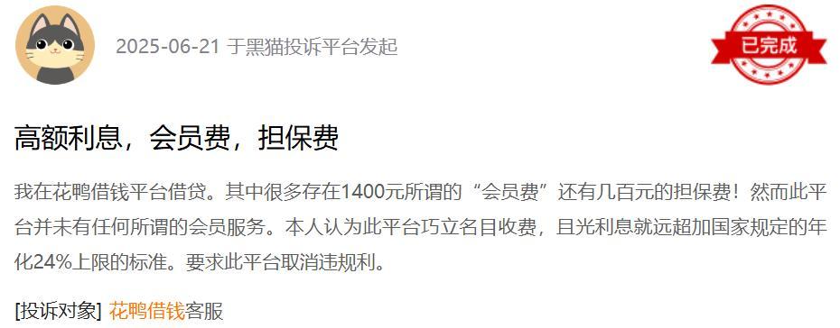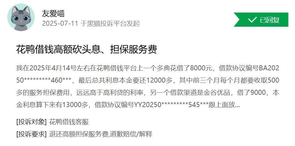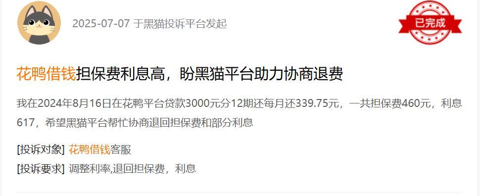 另有用户在黑猫投诉上称,2024年8月16日在花鸭平台贷款3000元,分12期还,每月还339.75元,一共担保费460元,利息617元。