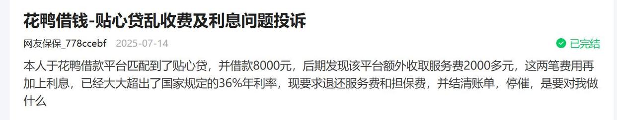 在消费保平台,有用户称自己在花鸭借款平台匹配到了贴心贷,借款8000元,后期发现该平台额外收取服务费2000多元,这两笔费用再加上利息,年利率已经大大超出了36%。