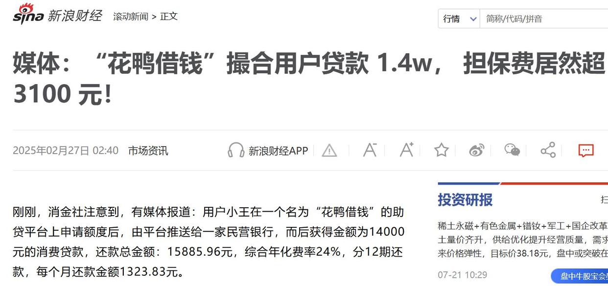 另外,人民日报旗下《国际金融报》报道显示,一名用户称通过“花鸭借钱”平台借到6600元,分12期还款,每月本息还款889.08元,翻看账单才发现被额外收取了1048.72元的担保费,还有每月38.92元的服务费,综合算下来,借款年化利率超过36%。
