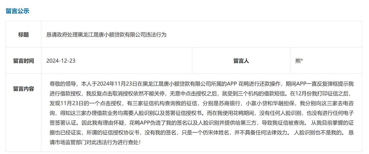 在黑龙江政府网站上,有多个投诉指向花鸭借钱违规使用个人信息问题,一位名叫“熊某”的用户投诉称:2024年11月,自己在花鸭APP还款时,反复弹出的借款授权窗口无法关闭。一次误触后,其征信竟被华融担保等三家机构同时查询。“所谓授权书只有仿宋体打印姓名,人脸识别也非我本人!” 而这三家机构均声称需用户主动签署文件并人脸验证,但花鸭APP全程未触发任何生物认证流程。熊某称:“我有理由怀疑花鸭APP伪造了我的签名及人脸识别提供给了第三方,导致征信被查。”