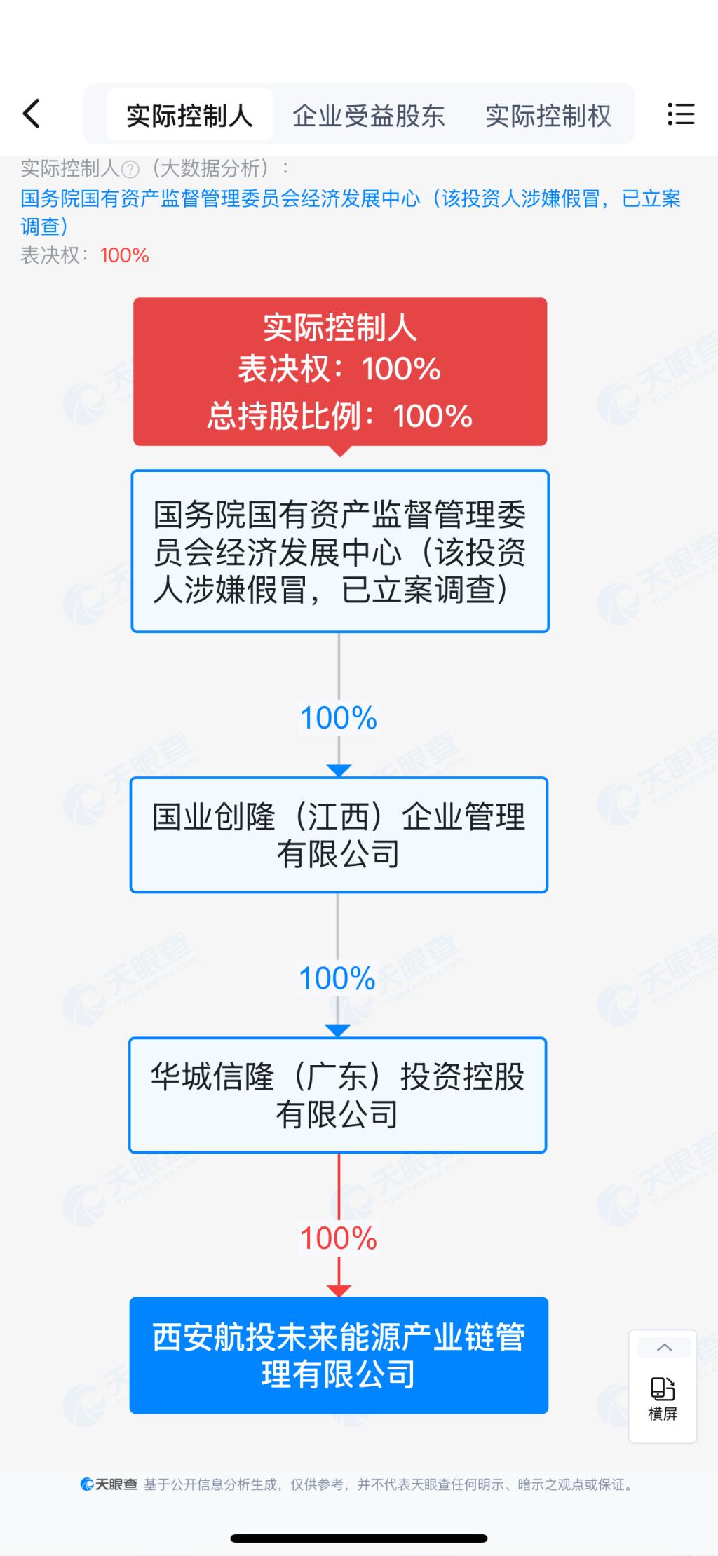 工商信息显示,西安航投未来能源产业链管理有限公司成立于2023年,系国业创隆企业管理有限公司成员,注册资本3000万人民币,法定代表人为杨震虎。该公司股权穿透后,由国业创隆(江西)企业管理有限公司旗下华城信隆(广东)投资控股有限公司100%持股;而前者则由“国务院国有资产监督管理委员会经济发展中心”全资持有。