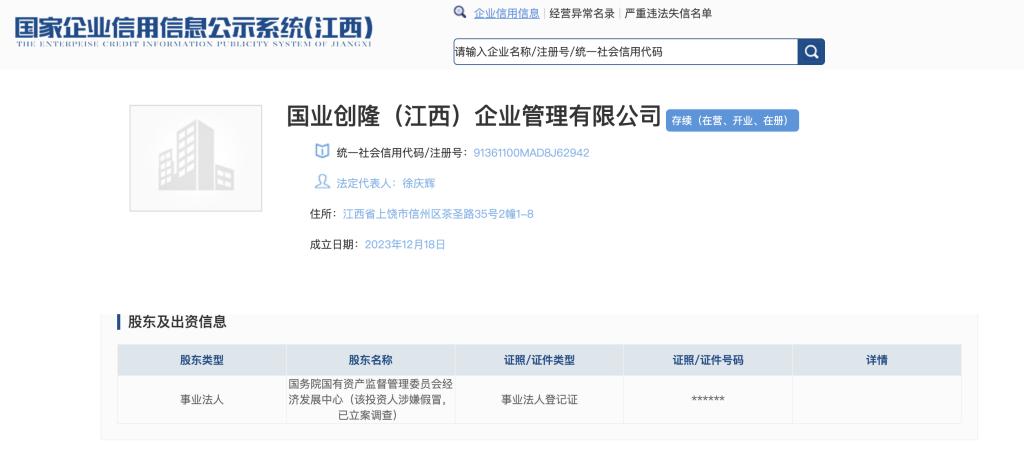 澎湃新闻看到,国家企业信用信息公示系统(江西)网站上,国务院国有资产监督管理委员会经济发展中心已被标注为“该投资人涉嫌假���,已立案调查”。
