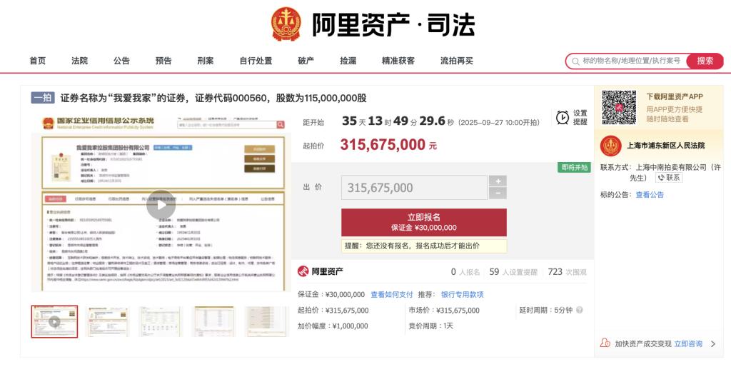 公开信息显示,上海市浦东新区人民法院将于2025年9月27日10时至2025年9月28日10时止(延时除外)在“淘宝网”阿里拍卖平台上进行公开拍卖活动,拍卖标的为谢勇持有的我爱我家1.15亿股股票。