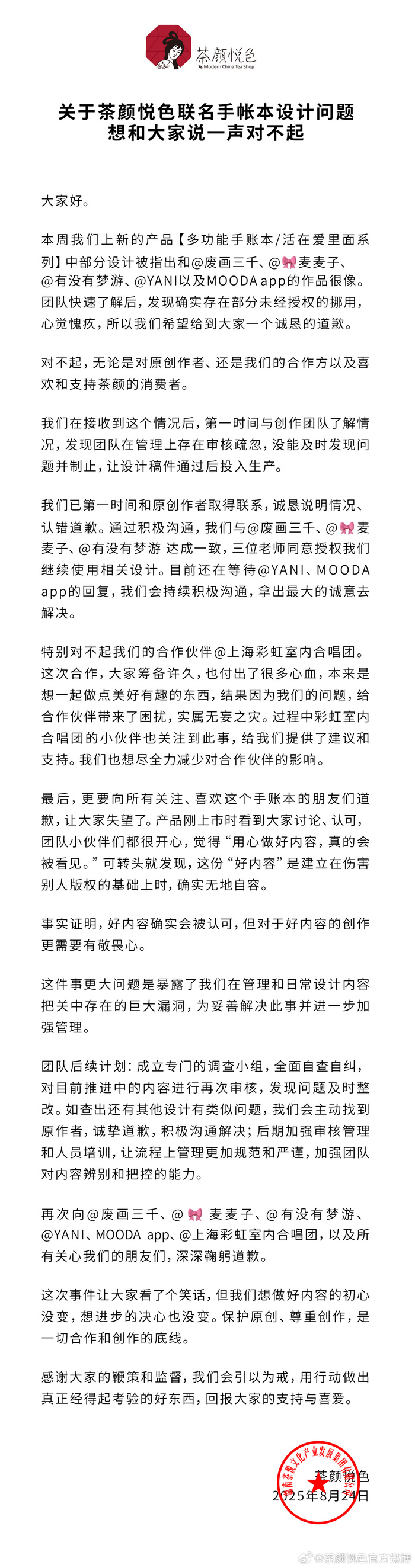 近日,多位博主先后在社交平台发文称,茶颜悦色与彩虹合唱团联名的手账本涉嫌抄袭其作品。对此,8月24日下午,茶颜悦色发文回应称,确实存在部分未经授权的挪用。团队在管理上存在审核疏忽,没能及时发现问题并制止,让设计稿件通过后投入生产。公司已第一时间和原创作者取得联系,诚恳说明情况,认错道歉。团队后续计划成立专门的调查小组,全面自查自纠,对目前推进中的内容进行再次审核,发现问题及时整改。