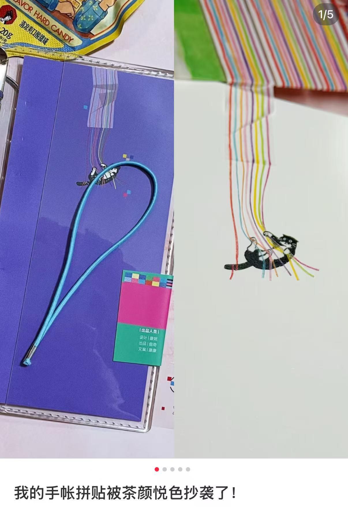同日晚,另一位手帐博主也发帖表示,自己的手帐拼贴作品创意也被茶颜悦色抄袭,内容包括手帐本的封底设计以及联名礼盒中的徽章,“我的拼贴作品用的是mt的彩铅线胶带,相信很多手帐er都很熟悉,他那边甚至连我的拼贴痕迹(胶带折痕)都一起照搬过去!我原本的小动物用的是猫猫胶带,估计是因为担心胶带版权问题他把我的猫头换成了狗头,小动物的身体依然还是我的猫猫…”截至记者发稿,茶颜悦色暂未回应该博主。