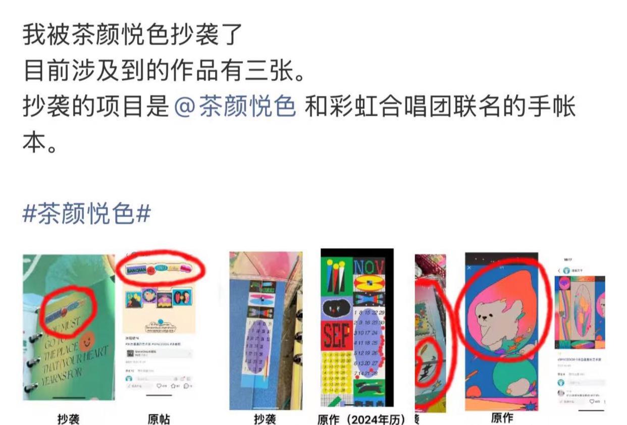 然而,8月23日,潇湘晨报辣椒财经记者发现,有设计师在社交媒体平台发帖,声称手帐本中多处设计元素涉嫌抄袭自己此前的作品,从该博主晒出的图片中,可以看出多个要素存在雷同;23日晚,茶颜悦色官方账号在该文下留言道歉,表示已联系作者:“非常抱歉大大老师,这边收到您的反馈,我们很重视,也在迅速自查了解情况中,希望能够尽快和您取得联系麻烦老师看下私信”。