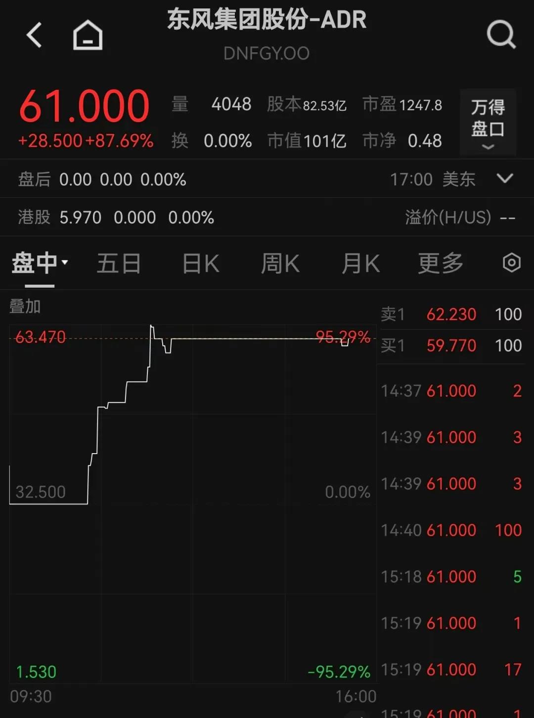22日晚公告一出,截至8月23日零点,东风集团股份ADR报价62.22美元,一个小时内暴涨超91%;收盘涨幅为87.69%,报61美元。