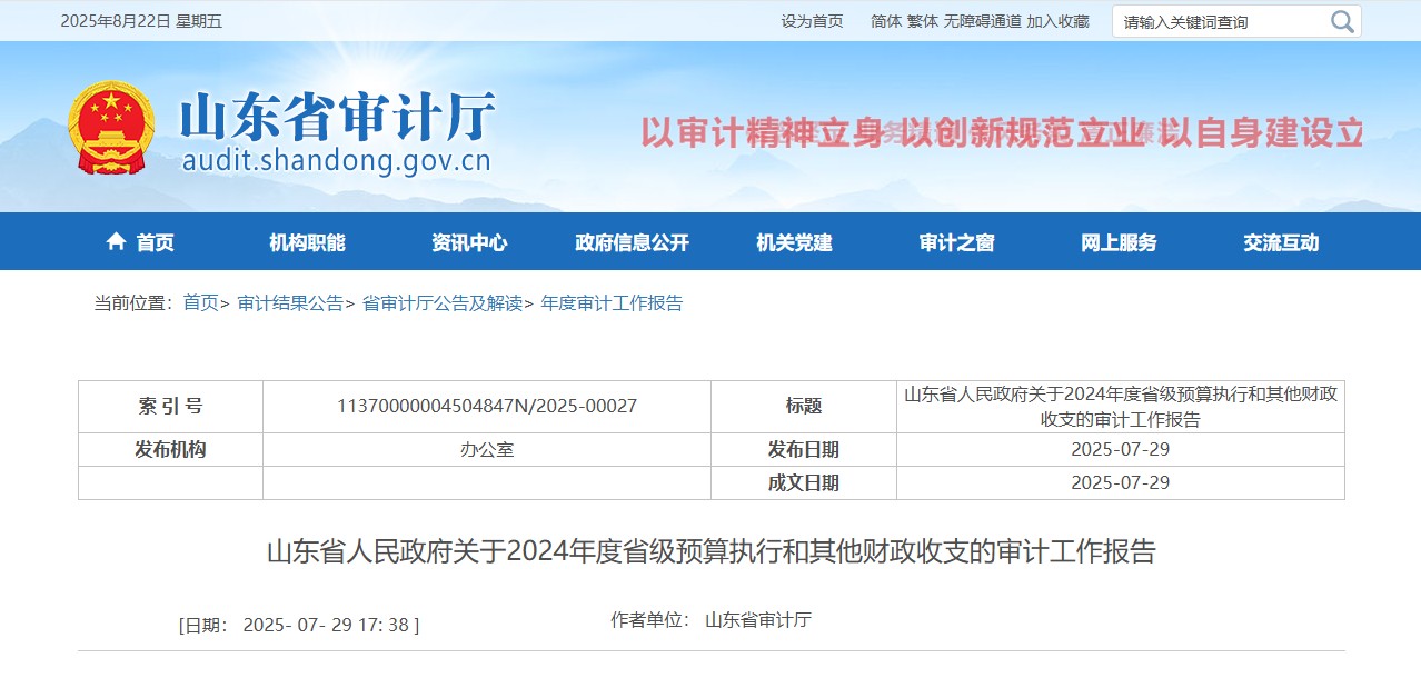 山东省人民政府关于2024年度省级预算执行和其他财政收支的审计工作报告。图片来源:山东省审计厅官网