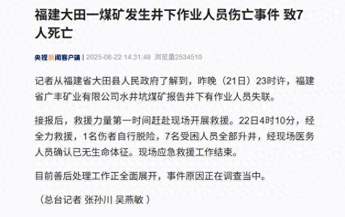 据央视新闻,8月21日23时许,福建省广丰矿业有限公司水井坑煤矿报告井下有作业人员失联。22日4时10分,经全力救援,1名伤者自行脱险,7名受困人员全部升井,经现场医务人员确认已无生命体征。