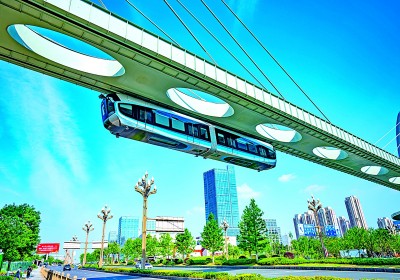 光谷空轨列车驶过武汉高新大道路段。光谷融媒体中心提供