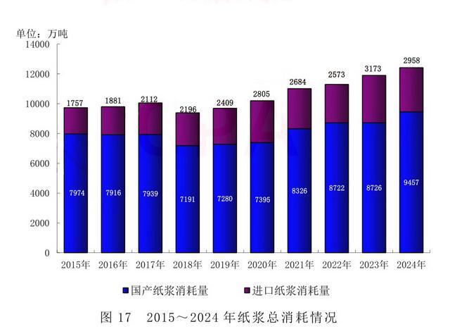 2015~2024年纸浆总消耗情况。资料来源:中国造纸工业2024年度报告