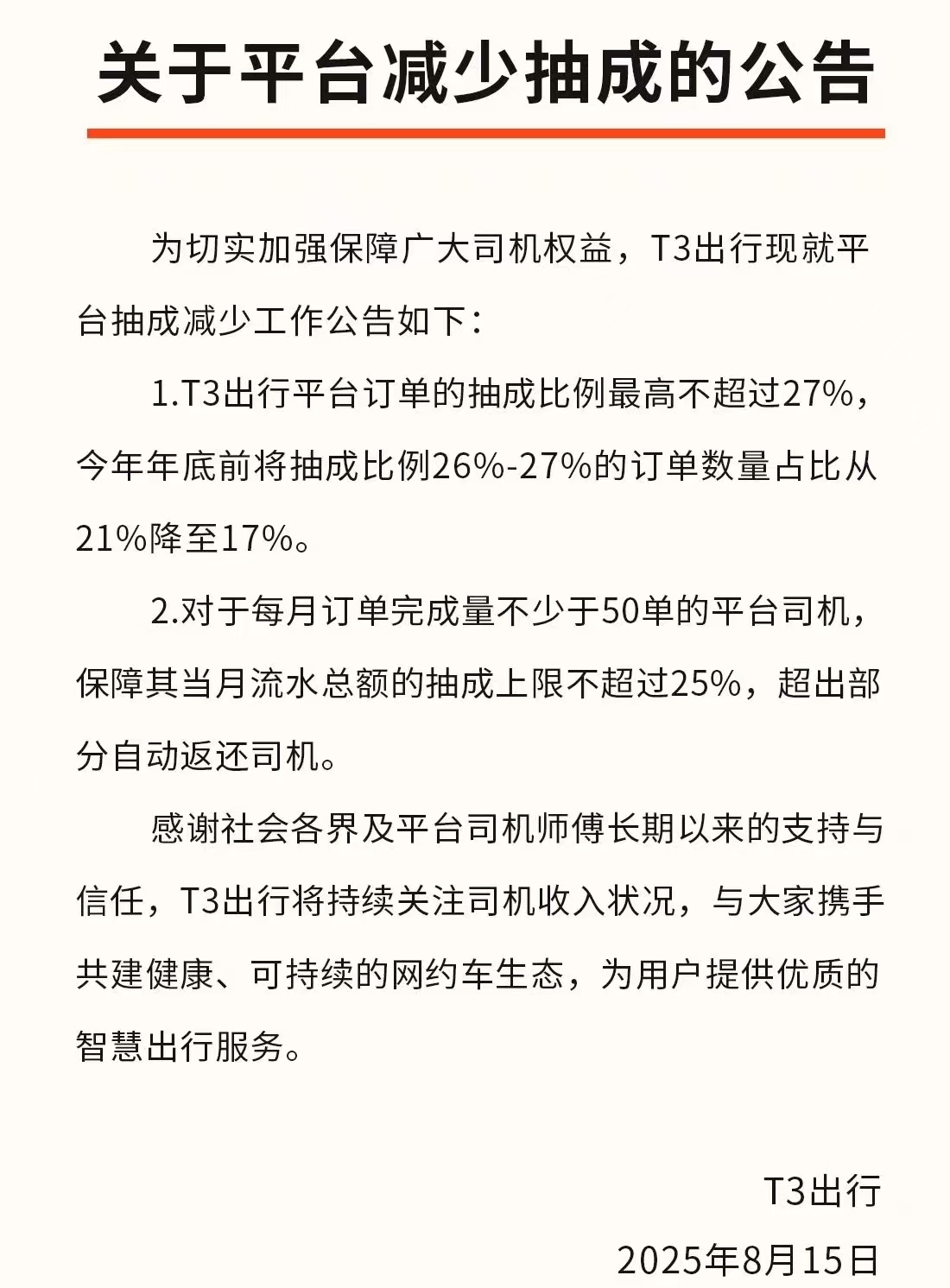 T3出行称,平台抽成比例最高不超过27%,今年年底前,抽成比例26%-27%的订单数量占比将从21%降至17%。