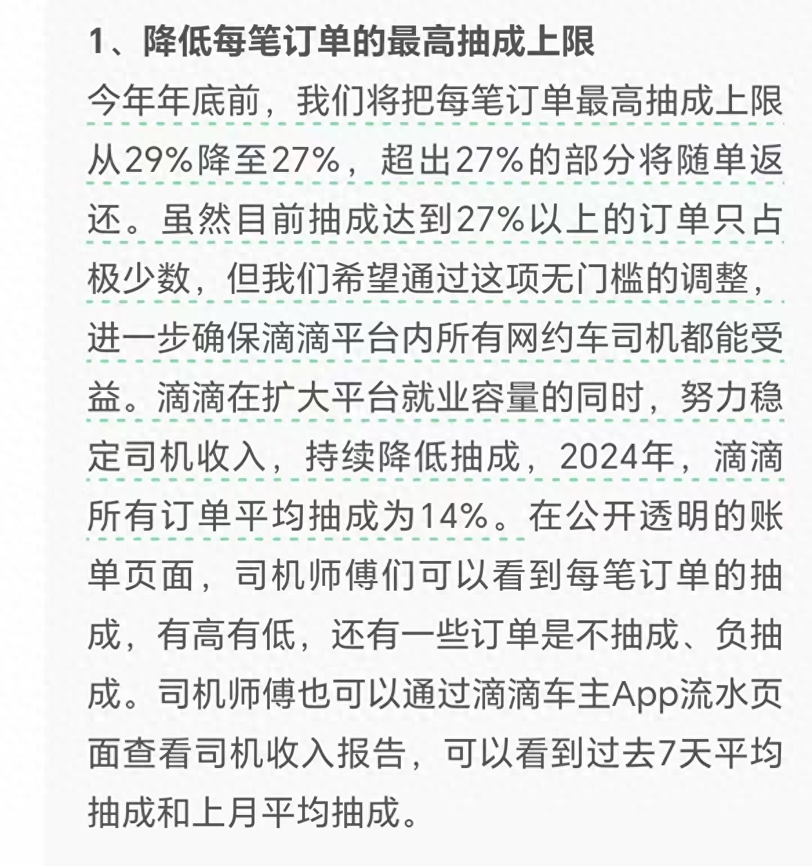滴滴出行介绍,今年年底前,将把每笔订单最高抽成上限从29%降至27%,超出27%的部分将随单返还。针对每月在平台完成订单达到50单的司机,通过“返佣宝”保障其当月月均抽成上限不超过25%,超过部分将在次月自动返还至司机账户。