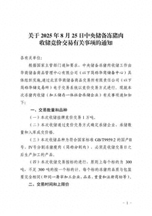 另外,华储网21日发布《关于2025年8月25日中央储备冻猪肉收储竞价交易有关事项的通知》,本次收储挂牌竞价交易1万吨。