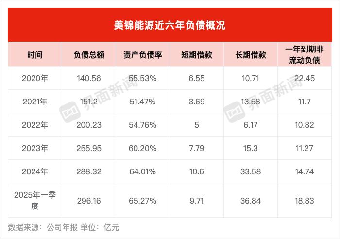 据界面新闻统计,2020-2024年,美锦能源资产负债率居高不下,分别为55.53%、51.47%、54.76%、60.2%、64.01%,今年一季度则攀升至65.27%。