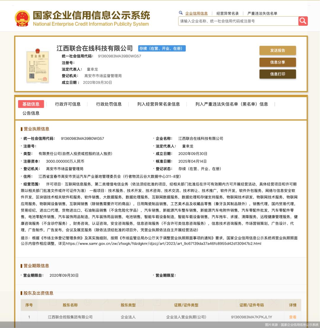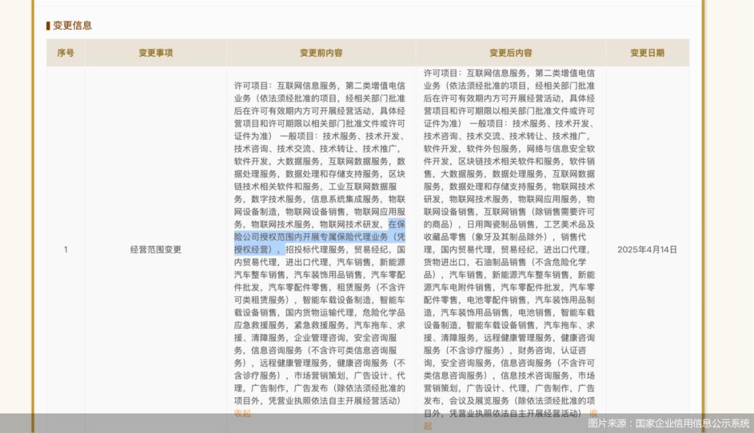 然而,在金融监管总局官网上,记者并未查询到江西联合在线科技具备任何保险中介资质的记录。此外,国家企业信用信息公示系统显示,今年4月后,“在保险公司授权范围内开展专属保险代理业务(凭授权经营)”这一业务已不在江西联合在线科技的经营范围中。
