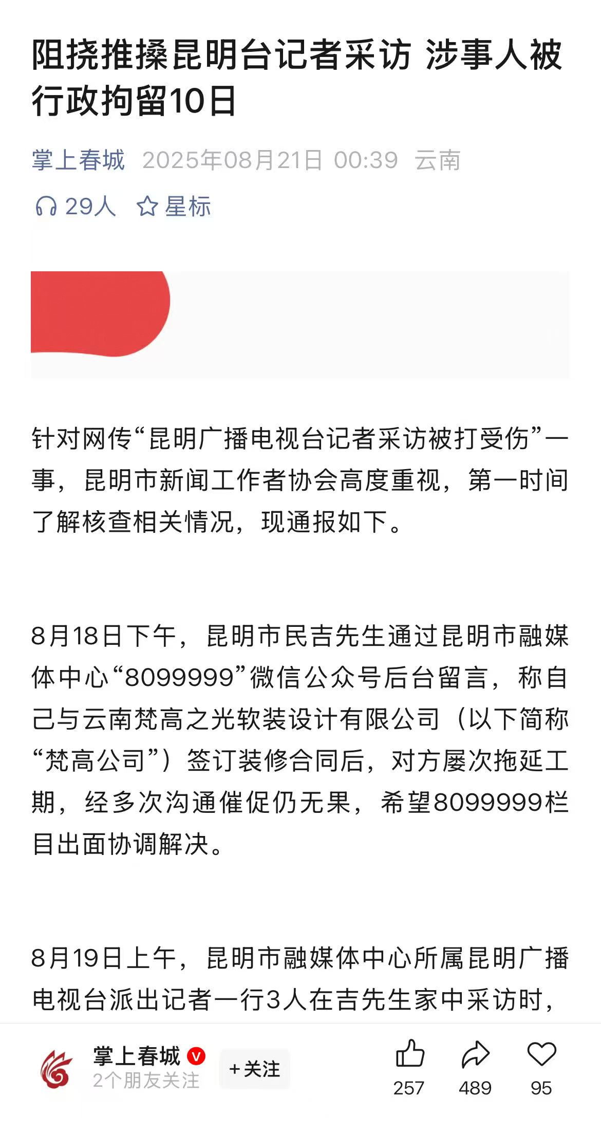 8月21日,掌上春城发布针对网传“昆明广播电视台记者采访被打受伤”一事通报:经调查,公安机关依据《中华人民共和国治安管理处罚法》,对夏某某故意损毁公私财物、故意伤害他人身体的行为处行政拘留十日,并处罚款200元。同时,经调解协商,梵高公司同意承担赔付摄像机遮光盖更换费用850元,赔付受伤记者在医院治疗期间费用及伤情鉴定费(依据发票据实结算),另赔偿记者误工费、交通费、精神损失费等费用20000元。经伤情鉴定,记者赵某某伤势为轻微伤。