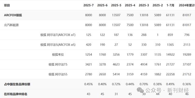 产品销量方面,极狐品牌整体表现仍显乏力。太平洋汽车数据显示,2024年极狐全年累计销量为81,017辆,占中国在售品牌份额仅0.36%,在所有品牌中排名第46位。极狐阿尔法S5成为销量主力,2025年5月达到峰值5,414辆,但7月回落至2,780辆;阿尔法T系列销量持续低迷,2025年2月仅售出1辆,7月也仅为125辆,市场接受度亟待提高。