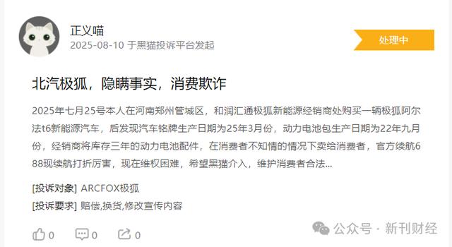 近日,在黑猫投诉平台上,某ARCFOX极狐车主表示,7月底在河南郑州的一家4S店购买了一辆极狐阿尔法T6新能源汽车,铭牌显示该汽车生产日期为2025年3月,但动力电池包生产日期却是为2022年9月。销售时工作人员未尽告知义务,车辆续航表现与官方宣称存在较大差距,要求赔偿、换货、修改宣传内容。