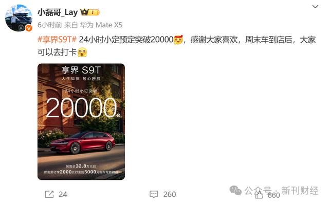 享界S9T已于8月18日启动预售,预售价32.8万元起。定位中大型旅行车,竞品包括腾势Z9GT和蔚来ET5T。据享界系列智选车产品总监小磊哥微博透露,该车型预售1小时小订突破1万台,24小时小订突破2万辆,显示出该系列的市场关注度有所提升,不过从小订到成交还有一定距离,具体销售数据还有待进一步披露。