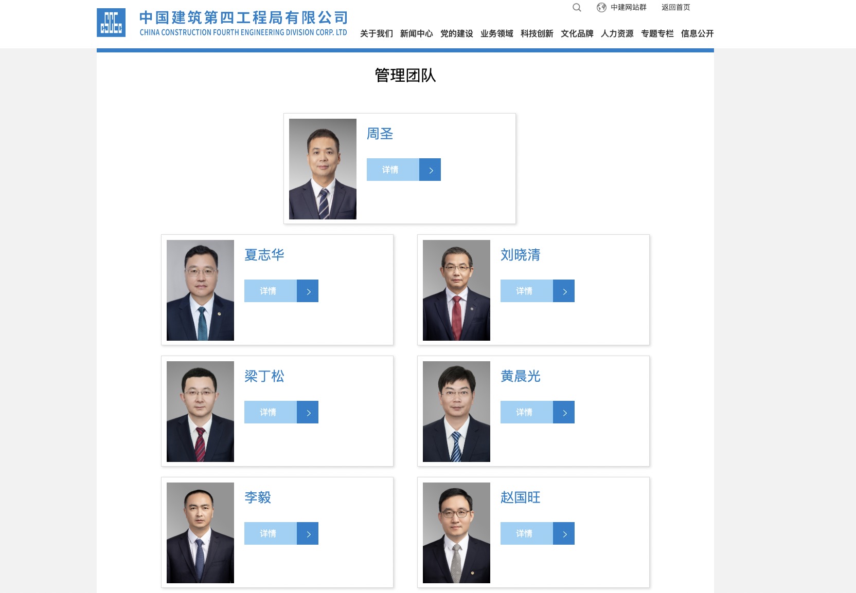 至此,47岁的周圣也成为中建八大工程局中最年轻的“一把手”。界面新闻发现,目前中建四局官网的管理团队页面也已更新,第一行换上了周圣的相片及职务信息。