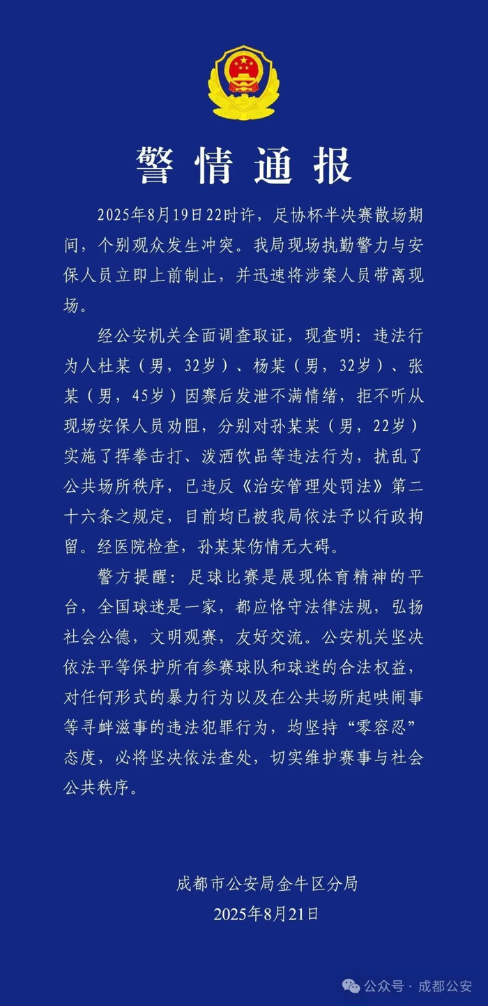 8月21日,成都市公安局金牛区分局发布警情通报:8月19日22时许,足协杯半决赛散场期间,个别观众发生冲突。我局现场执勤警力与安保人员立即上前制止,并迅速将涉案人员带离现场。经公安机关全面调查取证,现查明:违法行为人杜某(男,32岁)、杨某(男,32岁)、张某(男,45岁)因赛后发泄不满情绪,拒不听从现场安保人员劝阻,分别对孙某某(男,22岁)实施了挥拳击打、泼洒饮品等违法行为,扰乱了公共场所秩序,已违反《治安管理处罚法》第二十六条之规定,目前均已被我局依法予以行政拘留。经医院检查,孙某某伤情无大碍。