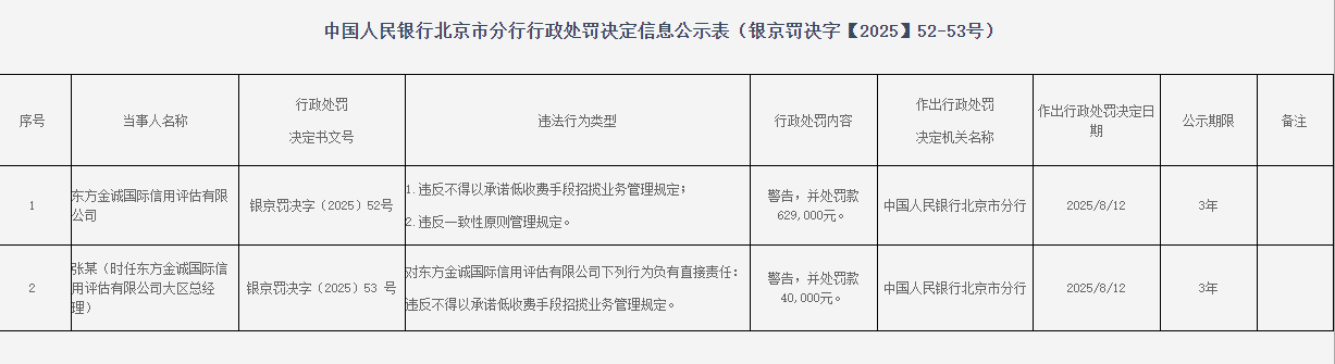 8月15日,中国人民银行北京分行公布一则行政处罚信息,对东方金诚国际信用评估有限公司(下称“东方金诚”)的违法行为作出处罚。