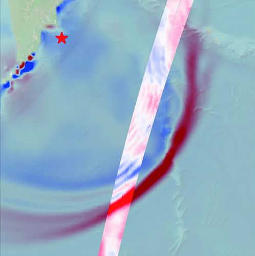 7月30日,SWOT捕捉到席卷太平洋的海啸波前沿。图片来源:NASA/JPL-Caltech