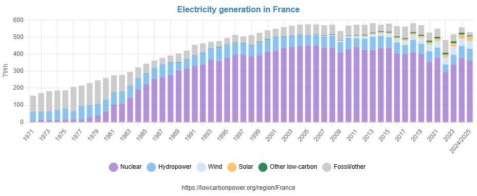 1973年的第一次石油危机暴露了法国对进口能源的高度依赖,迫使政府寻找替代方案。1974年,梅斯梅尔计划(Messmer Plan)启动,法国决定快速建设核反应堆。随后十年间,法国的核能发展迅速,给国内提供了稳定的电力供应。到1985年,核电已占法国电力供应总量约40%。