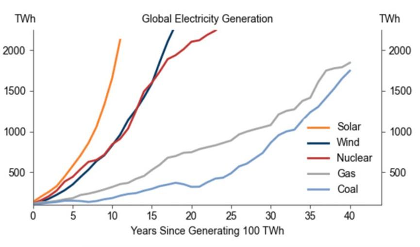 图2:全球各类能源达到100太瓦时发电量后的发展趋势,含太阳能(黄色)、风能(藏青)、核能(褐色)、天然气(灰色)、煤炭(蓝色)