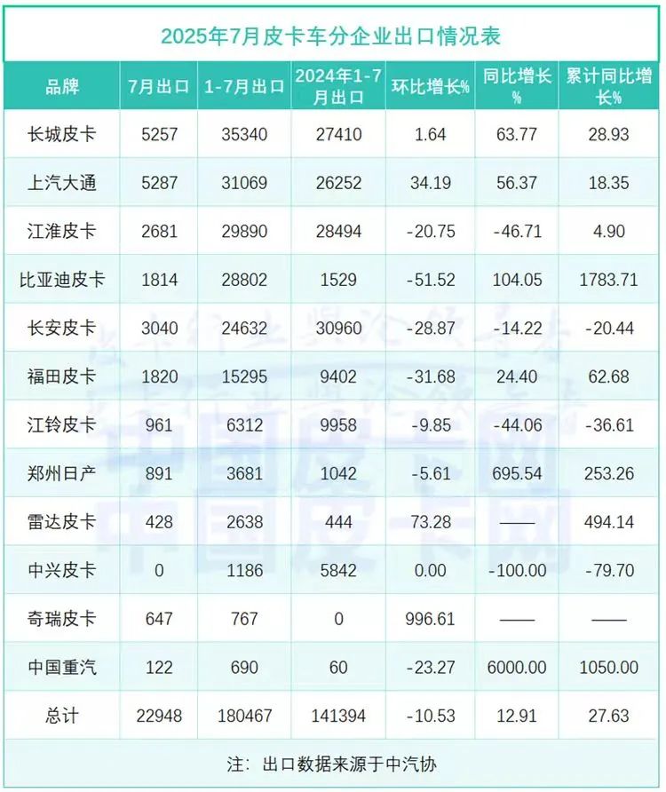 以比亚迪为例,7月皮卡出口同比增长104.1%,1-7月累计同比增长超1783%,在一众出口企业中表现最为亮眼,突显了其新能源转型优势。