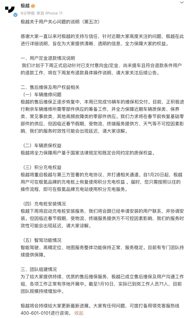 1月7日,极越官方账号发布了“极越售后问题解答公告”,称已成立售后维保及用户沟通工作小组,团队规模达50人。