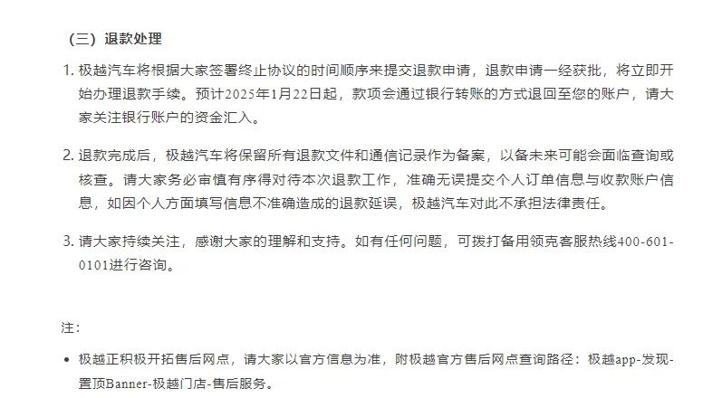 据《说明》,极越汽车将根据大家签署终止协议的时间顺序来提交退款申请,退款申请一经获批,将立即开始办理退款手续。预计2025年1月22日起,款项会通过银行转账的方式退回至用户账户。