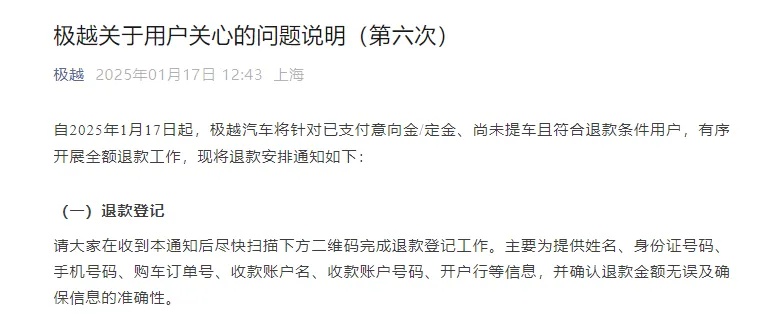 1月17日,极越发布《极越关于用户关心的问题说明(第六次)》(后简称《说明》):自2025年1月17日起,极越汽车将针对已支付意向金/定金、尚未提车且符合退款条件用户,有序开展全额退款工作。