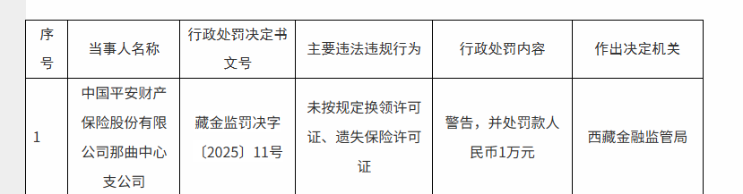 9月1日,国家金融监督管理总局处罚信息显示,中国平安财产保险股份有限公司那曲中心支公司因未按规定换领许可证、遗失保险许可证,被西藏金融监管局警告并处罚款人民币1万元。