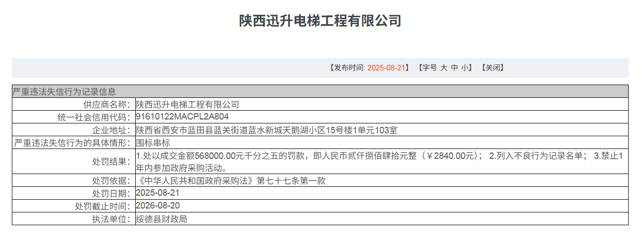 近日,军队采购网信息显示,陕西迅升电梯工程有限公司因围标串标,被绥德县财政局,对公司处以成交金额568000.00元千分之五的罚款,即人民币贰仟捌佰肆拾元整(¥2840.00元)并列入不良行为记录名单,禁止1年内参加政府采购活动。