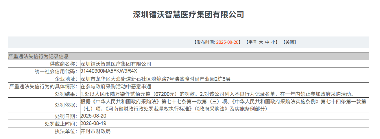 近日,军队采购网信息显示,深圳镭沃智慧医疗集团有限公司因在参与政府采购活动中恶意串通,被开封市财政局,对处以人民币陆万柒仟贰佰元整(67200元)的罚款并对该公司列入不良行为记录名单,在一年内禁止参加政府采购活动。