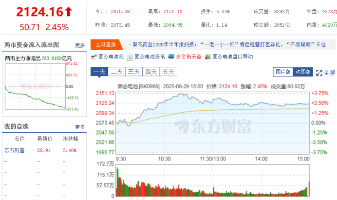 8月29日,东方财富网信息显示,截至15:00,固态电池(BK0968)板块价格为2124.16元/股,涨幅为2.45%。其中多支概念股20CM涨停,先导智能、杭可科技20%涨停,国轩高科、璞泰来、中一科技等封板,贝特瑞、中科电气、德瑞锂电涨超10%,宁德时代、亿纬锂能等跟涨。