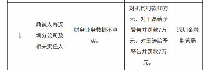 近日,国家金融管理总局信息显示,鼎诚人寿深圳分公司及相关责任人因财务业务数据不真实,被深圳金融监管局对机构罚款40万元,对王磊给予警告并罚款7万元,对王涛给予警告并罚款7万元。
