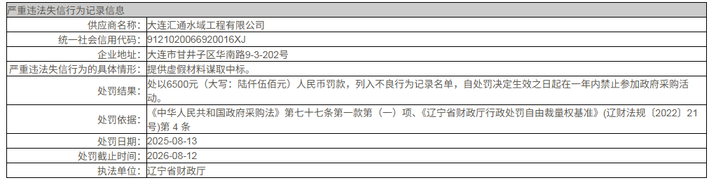 近日,军队采购网信息显示,大连汇通水域工程有限公司因提供虚假材料谋取中标,被辽宁省财政厅处以6500元人民币罚款,列入不良行为记录名单,自处罚决定生效之日起在一年内禁止参加政府采购活动。